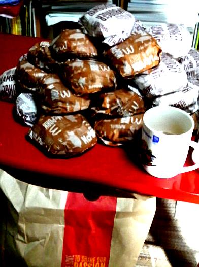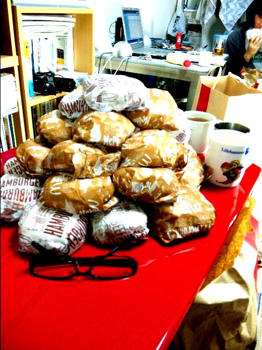 25個のマックポークと25個のハンバーガーと2個のクオーターパウンダーを喰いまくる。ただそれだけ。胃袋の蠕動する音、大量の肉塊を前にしたときに咽喉からこぼれ出る絶望という名の呻き声、そしてパブロフの犬が如き垂涎音、これらが三位一体となって奏でる地獄のアンプラグド・インプロビゼーション!!!立ち現れたるはまさに涅槃の境地!!!バーミヤン!バーミヤン!!ばーみやんばんざーーーーい!!!
