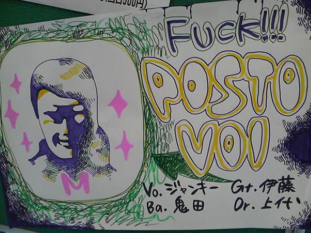 「それじゃいかんだろう」、と声を大にして言いたくて集まった連中がPOSTOVOIだとわたしは思っています。テクニックだけが能じゃないだろう、奇を衒うだけが能じゃないだろう、気取るだけが能じゃないだろう、口先の言葉を吐くだけが能じゃないだろう、安易な予定調和で終わるだけが能じゃないだろう。そういう思いを込めてPOSTOVOIをやってきたつもりでしたが、結果的に、何も伝わってなかった気がします。それはこっちの力量の問題なんですが。でも、なんかこう、もっと視野を広くしたほうが絶対に良い気がします。お客様、もっと、音楽を音楽として聴いたほうが、もっともっと楽しいと思います。だから、目くそ鼻くそのような島根のライブハウスに高い金を払うのもいいですけど、もっといっぱいいろんなCDを聴いて、世界を広げてみてもいいんじゃないでしょうか、ってわたしなんかは思ったりするんですが、偉い人にはそれがわからんのです。